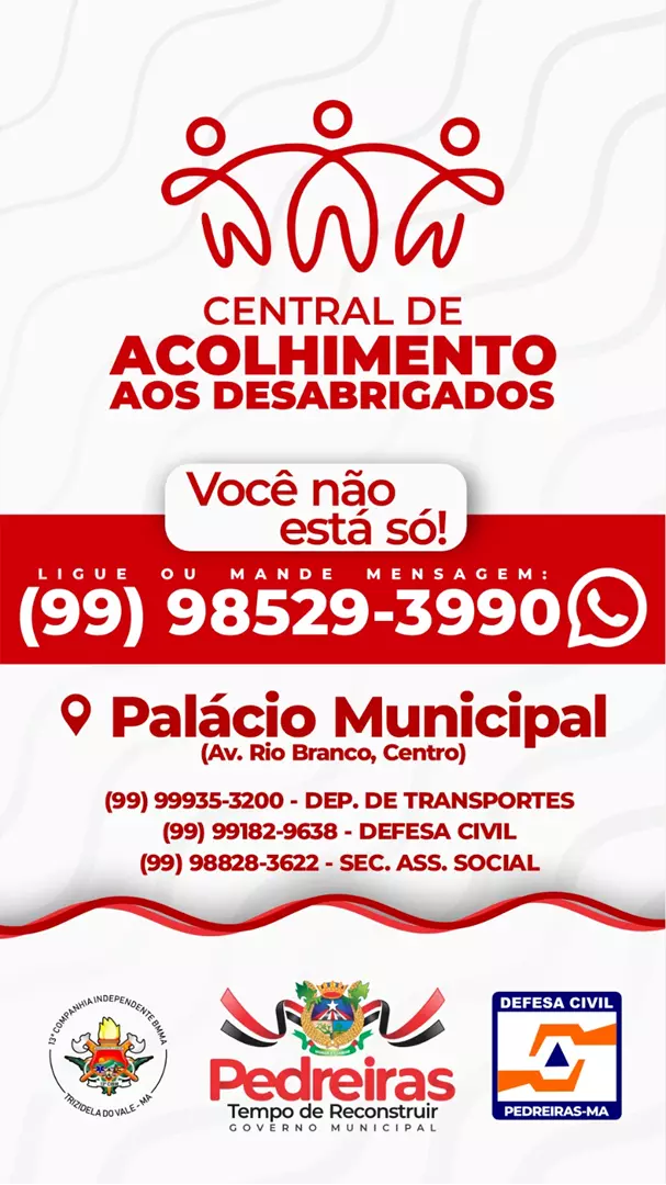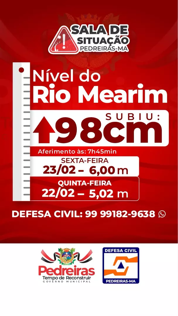 Nesta sexta-feira (23), a Prefeitura de Pedreiras emitiu boletim de aferimento do Rio Mearim, que está com 6,00 metros. A gestão divulgou ainda telefones da Central de Acolhimento aos desabrigados.