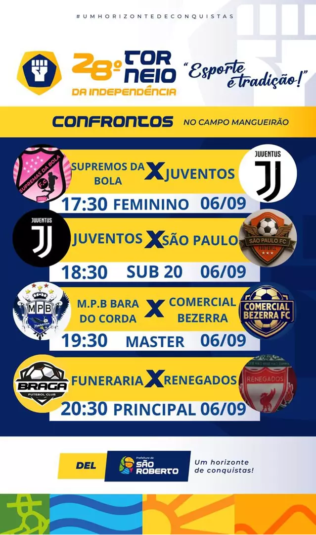 Encerra neste sábado, 06, a 28ª edição do Torneio da Independência, com a participação de equipes de várias cidades da região, nas categorias: principal, master, sub-20 e feminino, movimentando a cidade de São Roberto.